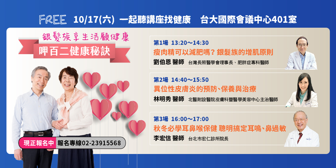 10/17(六)健康公益講座主題︰體重管理+異位性皮膚炎+耳鳴、鼻過敏治療